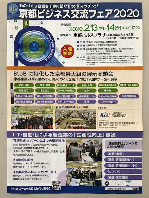 最初の展示会「京都ビジネス交流フェア2020」の開催が近づいて参りました。